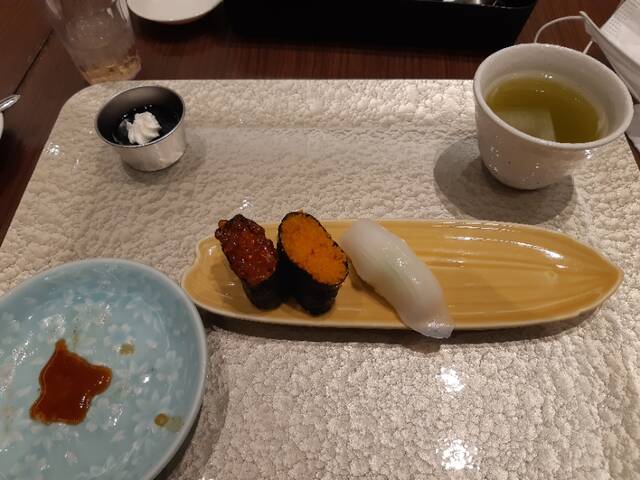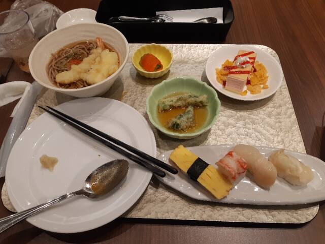 二回目。天ぷらとそば、サーモン、ミルフィーユ、寿司
