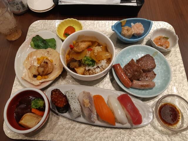 寿司、ステーキ、ウインナー、ホタテ塩辛、シュウマイ、スープカレー、焼きホタテ、ビーフシチュー