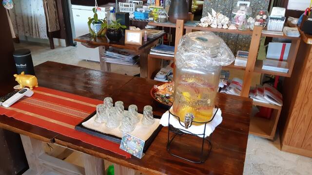 ロビー。ついたときにはちょうど宿の人が誰もおらず、クーラーがきいて涼しいロビーでしばらく待っていた。