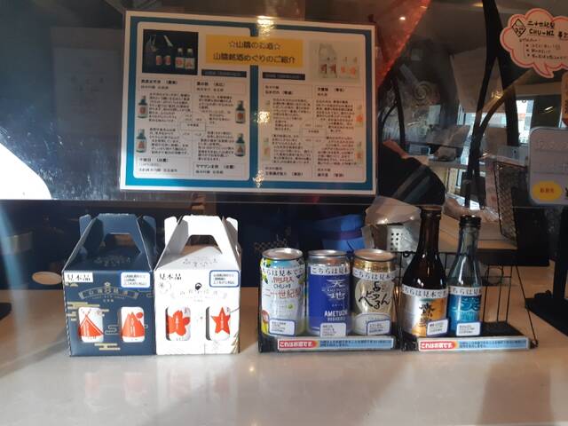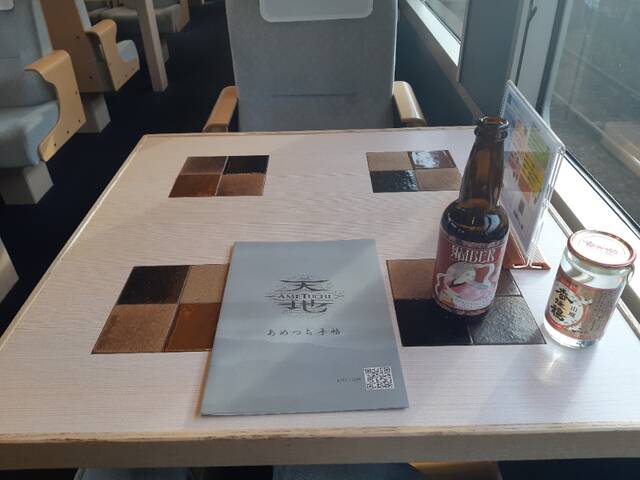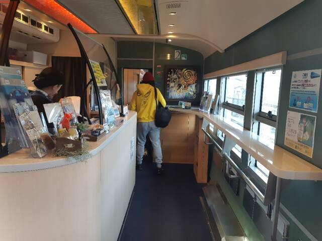 あめつちの車内販売は、発車前から始まります。車内にショップがあり、ここであめつちグッズやコーヒー、アルコールなどが売られています。
